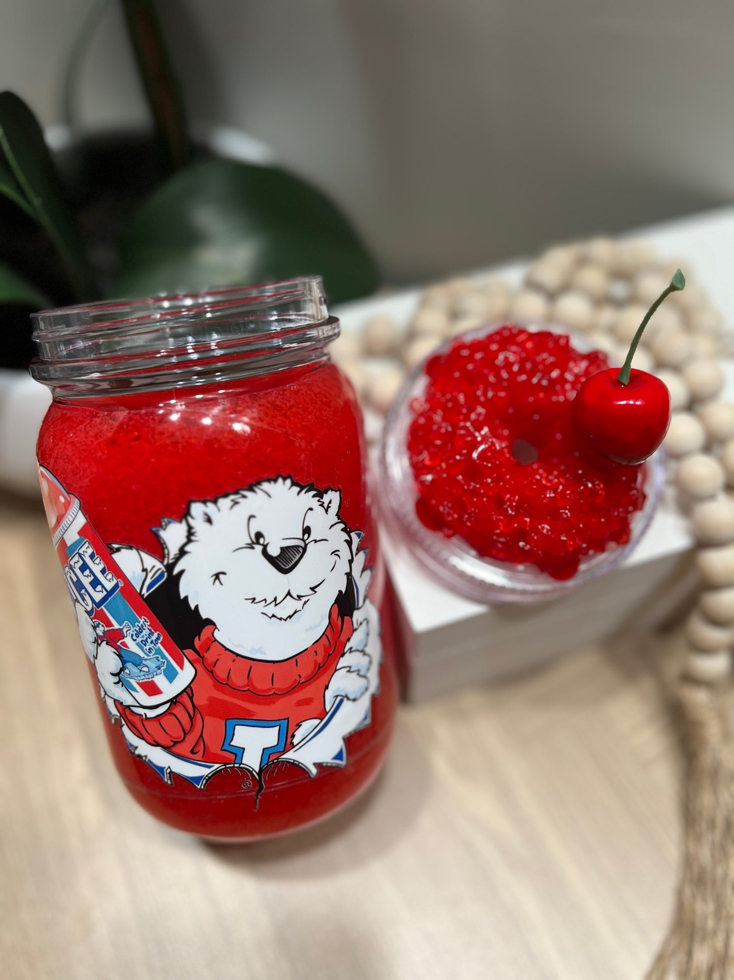 20oz Mason Jar w/slushy or iced lid of your choice with a realistic fruit to match